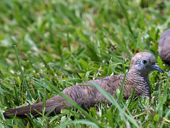 [Zebra Dove]Zebra doves are also quite populous in Hawaii. They can be found singly or in small groups of up to 10. If fed, they will cluster and gather into large groups of possibly 50. They are gentle birds, and very trusting of people, often to their own detriment because they get smashed by cars quite frequently. They have a lovely cooing song that is very pleasing and relaxing to hear. It is what a bird would sound like if they could purr like a cat.